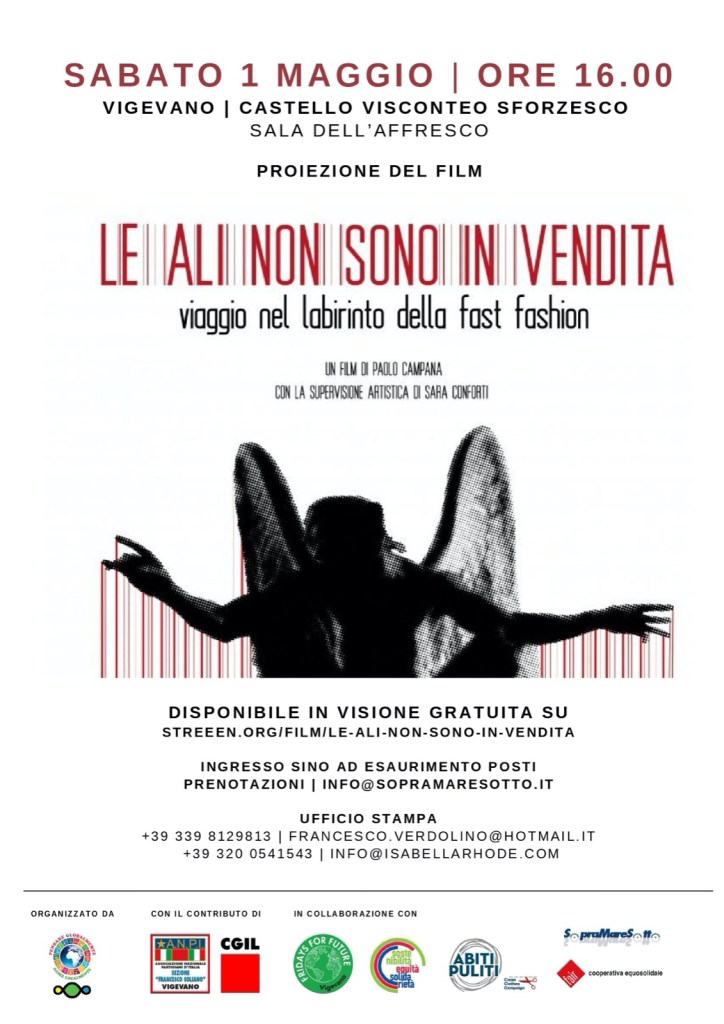 Sabato Primo Maggio, presso la Sala dell’Affresco del Castello Visconteo-Sforzesco di Vigevano verrà proiettato il docufilm Le ali non sono in vendita, viaggio nel labirinto della fast fashion, diretto da Paolo Campana, con la supervisione artistica di Sara Conforti e prodotto da FAIR, che racconta un percorso durato un anno per riflettere insieme a ragazzi e ragazze sul fenomeno della fast fashion. Il film interseca arte e attivismo: al documentario con interviste su temi complessi si affianca infatti il viaggio onirico ed estetico degli studenti e il loro percorso di riappropriazione dei propri vestiti.