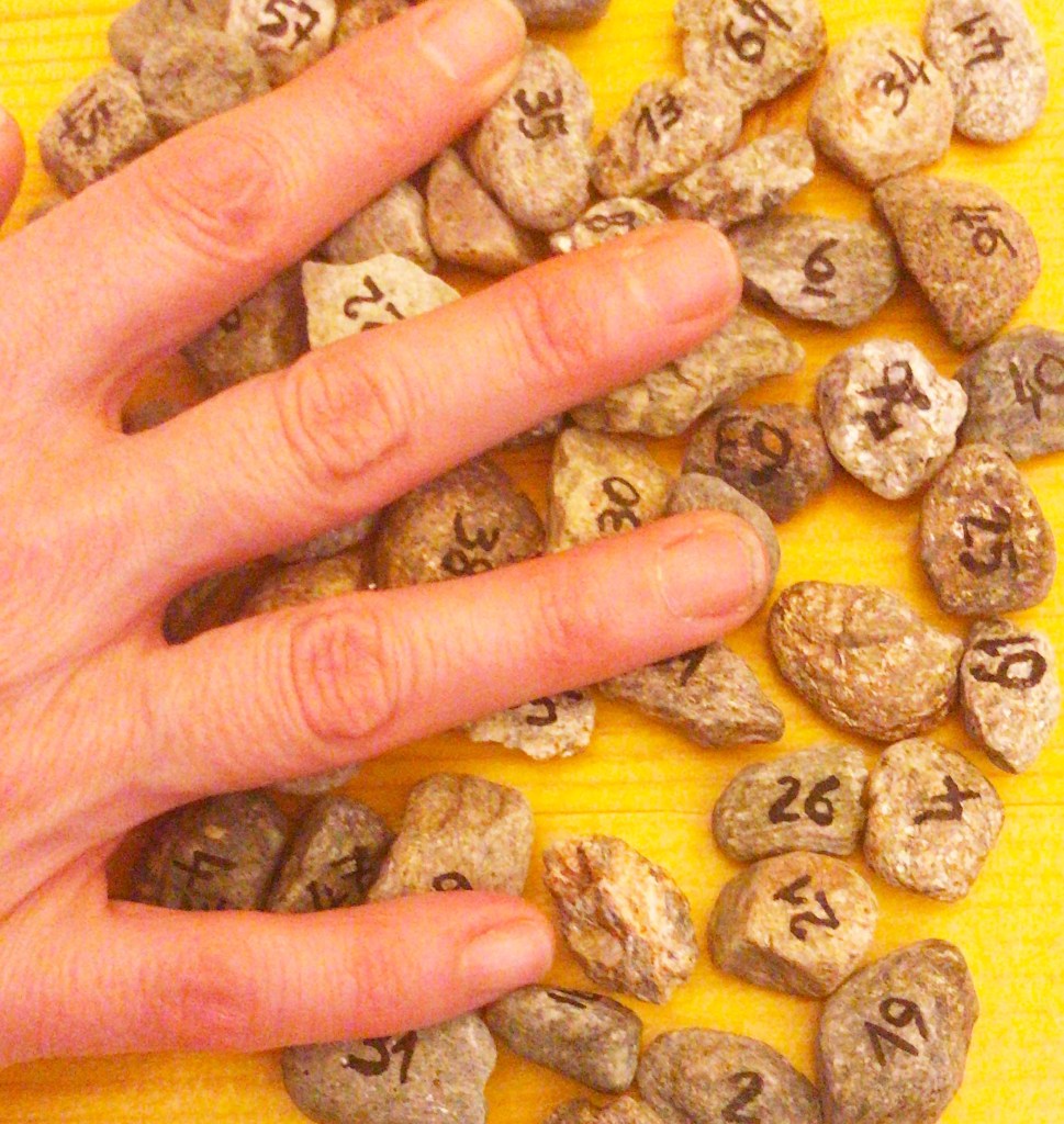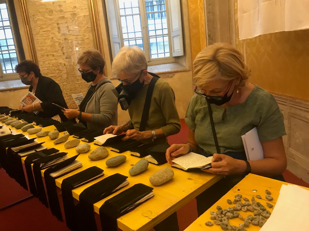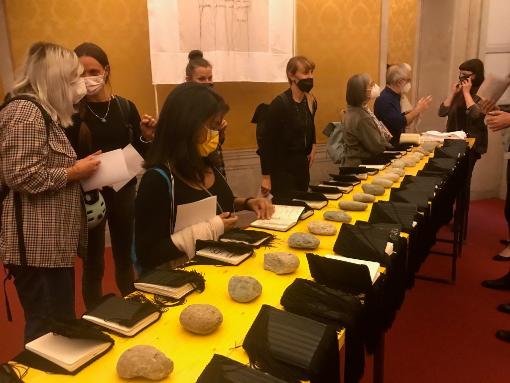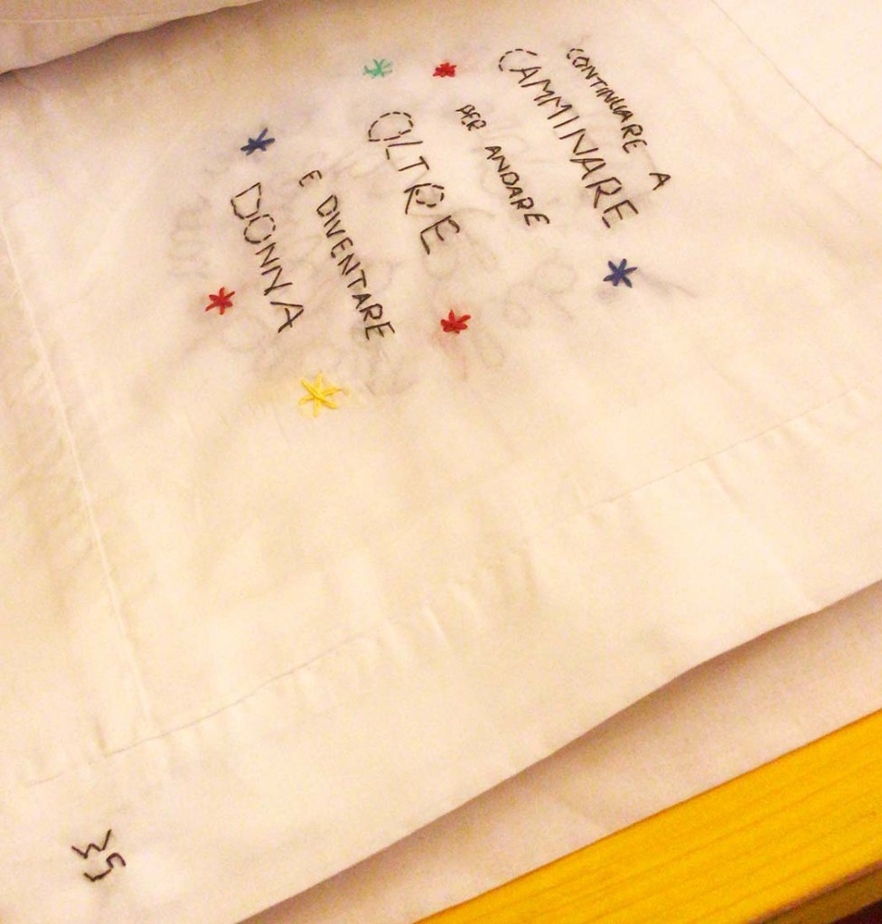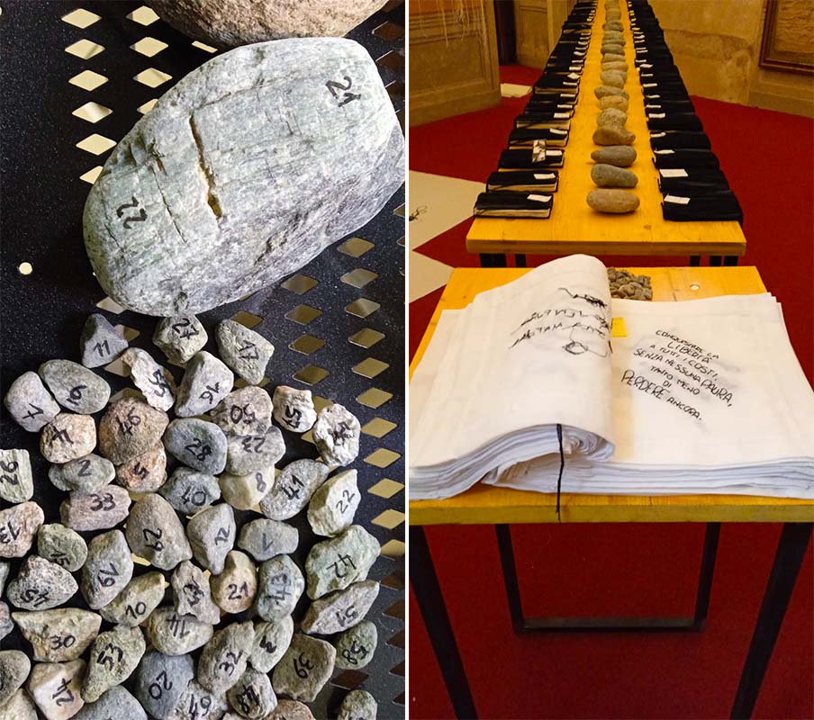 un’ulteriore occasione per indagare un mondo parallelo a quello dell’apparenza, ed esplorare universi di conoscenze eteree, spesso tralasciati dalla prassi artistica contemporanea. A seguito di poche e semplici regole il pubblico potrà interagire con le opere, i ricami rilegati nel libro di fortuna ed i taccuini realizzati dalle partecipanti ai workshop, tirando a sorte un numero da un insieme di piccoli sassi cifrati. L’utente potrà così rivolgere verso sé stesso la domanda what comes first? Cosa viene prima? Verrà così incoraggiato ad aprire il libro ed a scoprire una possibile risposta da approfondire accedendo alla lettura del taccuino cifrato e realizzato da una delle protagoniste verso la quale è stato inevitabilmente trascinato dalla sorte. Egli dovrà entrare in empatia con una storia scritta e istoriata da una sconosciuta e dovrà trarne auspici riferendoli ad una situazione di vita che gli appartiene.
