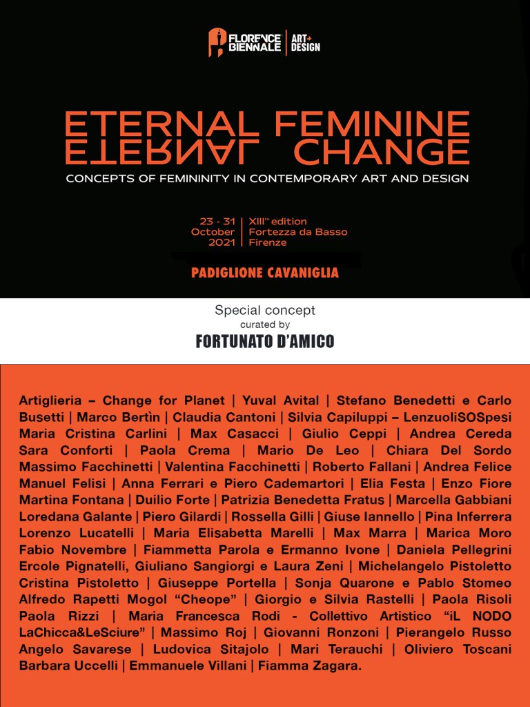 La 13ª Florence Biennale, ospiterà al Padiglione Cavaniglia dal 23 al 31 ottobre 2021, lo special concept curato da Fortunato D’Amico, dal titolo Eternal Feminine Eternal Change, che ospiterà esclusivamente le installazioni di oltre 60 artisti, selezionati dal curatore in chiave interdisciplinare e multiculturale,  i quali si sono impegnati a realizzare opere individuali e collettive, sul tema della mostra.