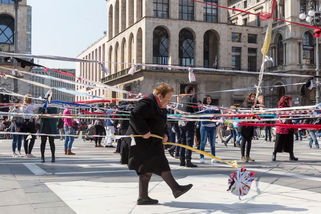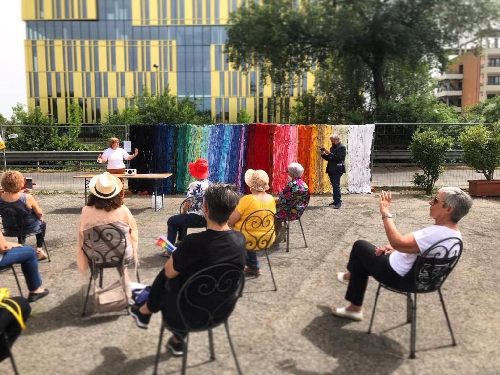 Grazie all’incontro tra le donne e i ragazzi, sono state realizzate due opere significative nel 2020: un Calendario Sociale dedicato all’arte al femminile, ogni mese dedicato ad un’opera di un’artista donna dove Le Sciure hanno posato come modelle insieme ai ragazzi, e la Bandiera della Speranza, un grande telaio umano con tanto di trama e ordito, due squadre di persone, e la spola, di mano in mano, a turno avanti e indietro, su e giù, a passare un gomitolo multicolore, in un percorso che parte dal nero fino a giungere alla luce attraverso uno spettro di colori, a simboleggiare il passaggio di un pensiero attraverso la speranza e alla creazione di nuove possibilità. Questa performance è stata realizzata al Parco Spezia, in una struttura anch’essa recuperata da EXPO 2015 e destinata ad un nuovo uso.