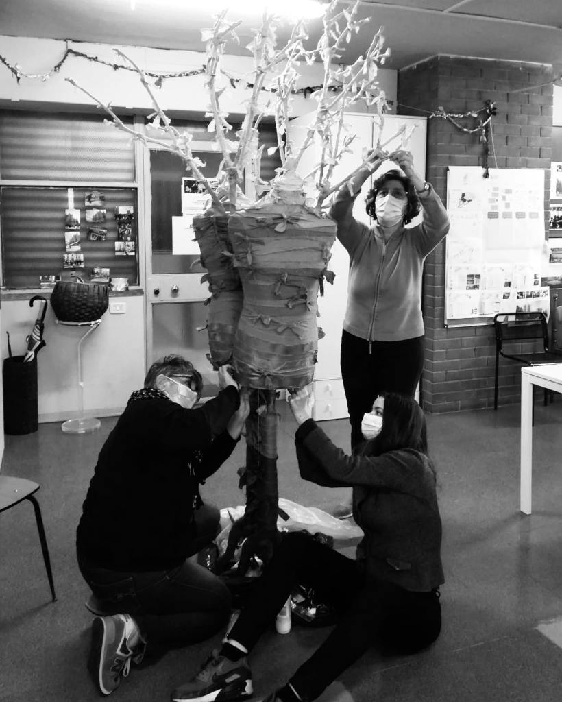 Dall’incontro tra queste donne di valore, nasce il Collettivo Artistico: “IL NODO LaChicca&LeSciure” e l’idea di realizzare la prima opera collettiva: Per fare l’albero ci vuole Il Nodo, scultura multicolore realizzata partendo da strisce di tessuto riciclato e annodato. Questo è stato il primo seme piantato con il desiderio di dare una seconda vita ad abiti e tessuti dismessi, oggetti vissuti e quasi dimenticati, tramite il lavoro di squadra e la speranza, con materiali di riciclo, dove ogni partecipante ha donato una parte di sé cedendo qualcosa di dismesso, come vecchie stoffe, e laddove non è stato possibile, il mercatino “Tra Noi e Voi” si è impegnato a procurare il necessario.