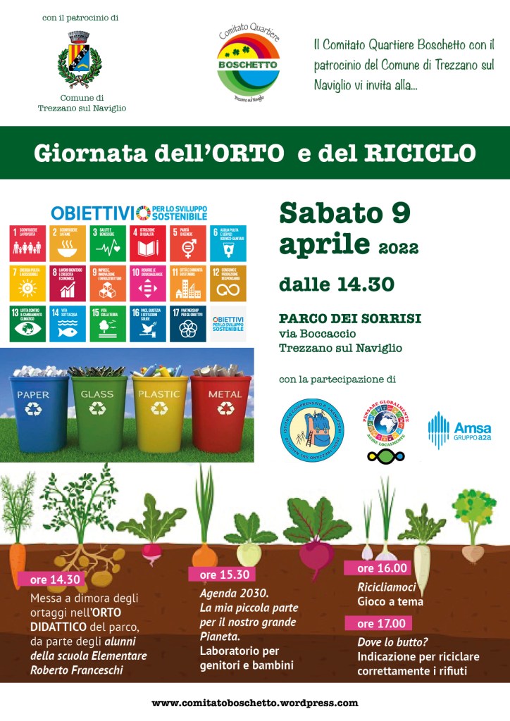 In occasione della Giornata della Terra, vi vogliamo raccontare della nostra partecipazione alla Giornata dell’Orto e del Riciclo, svoltasi sabato 9 Aprile e organizzata dal Comitato Quartiere Boschetto, di Trezzano sul Naviglio, presso il Parco dei Sorrisi: un percorso per scuole e famiglie finalizzato alla presa di consapevolezza, da parte di ciascuno, delle potenziali azioni concrete, individuali e collettive, per salvaguardare il benessere di tutti noi e delle nuove generazioni.
