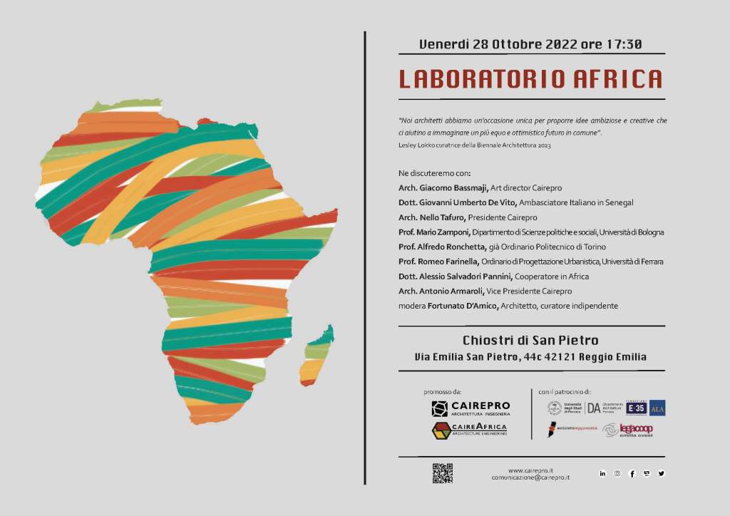 Il convegno Laboratorio Africa organizzato da Cairepro in occasione dei 75 anni di storia della Cooperativa Architetti e Ingegneri di Progettazione si svolgerà venerdì 28 ottobre alle ore 17:30. I Chiostri di San Pietro a Reggio Emilia ospiteranno l’evento dedicato al continente africano: un’analisi storica, antropologica, urbanistica e architettonica; interverranno sul tema accademici, professionisti, imprenditori, cooperatori e amministratori pubblici.