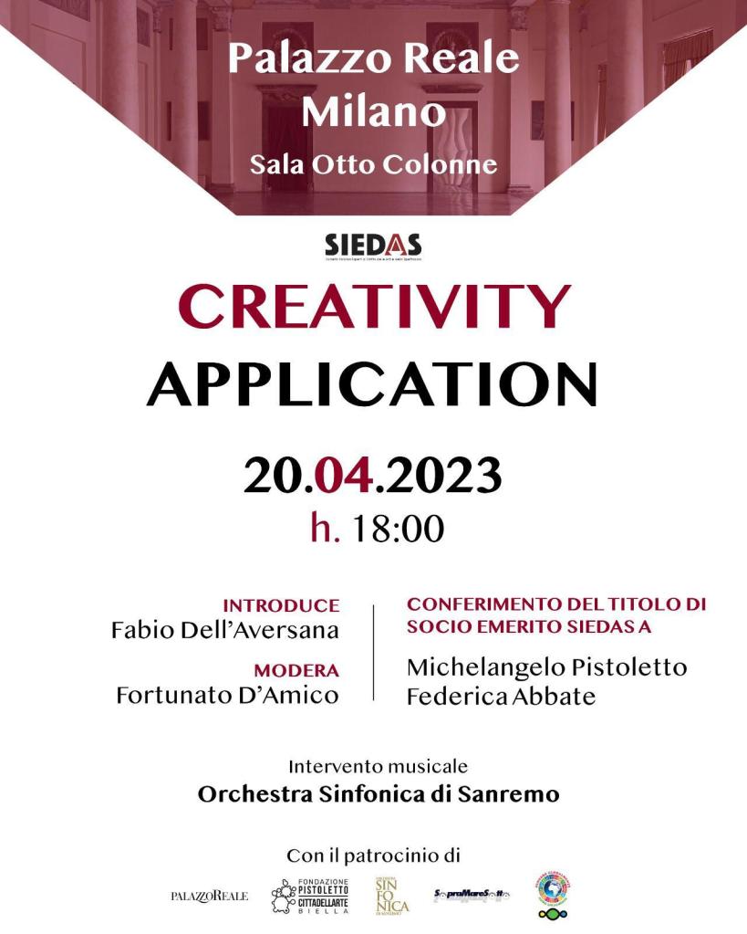 Milano. In una Milano in fermento per l’attesissimo Salone del Mobile, punto di riferimento per chi opera nel settore del design, il prossimo 20 Aprile a partire dalle ore 18.00, presso la magnifica Sala delle Otto Colonne di Palazzo Reale, si svolgerà l’evento dal titolo “Creativity Application”