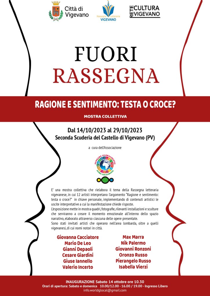 E’ una mostra collettiva che rielabora il tema della Rassegna letteraria vigevanese, in cui 12 artisti interpretano l’argomento “Ragione e sentimento: testa o croce?” in chiave personale, implementando di contenuti artistici le uscite interpretative a cui la manifestazione chiede risposte. L’esposizione mette in mostra quadri, fotografie, rilevanti installazioni e sculture che serviranno a creare il momento emozionale all’interno dello spazio narrativo, elaborato attraverso ciascuna delle opere presentate. Sono stati invitati artisti che operano nell’area lombarda, oltre a quelli vigevanesi, di cui nomi notori in città.